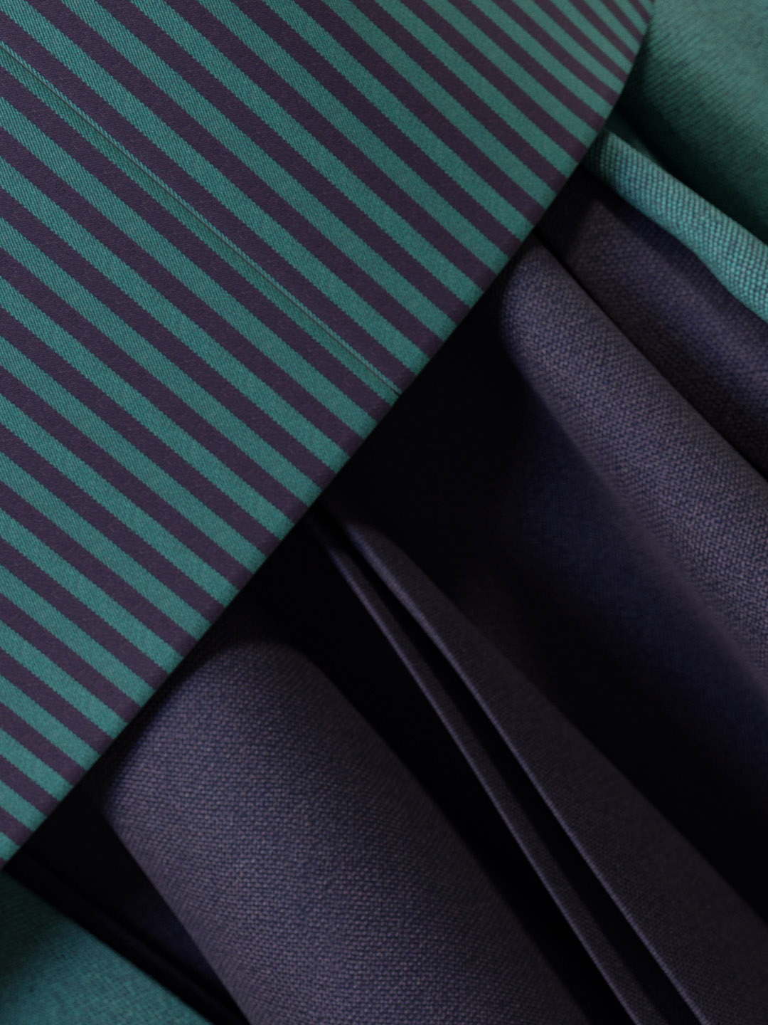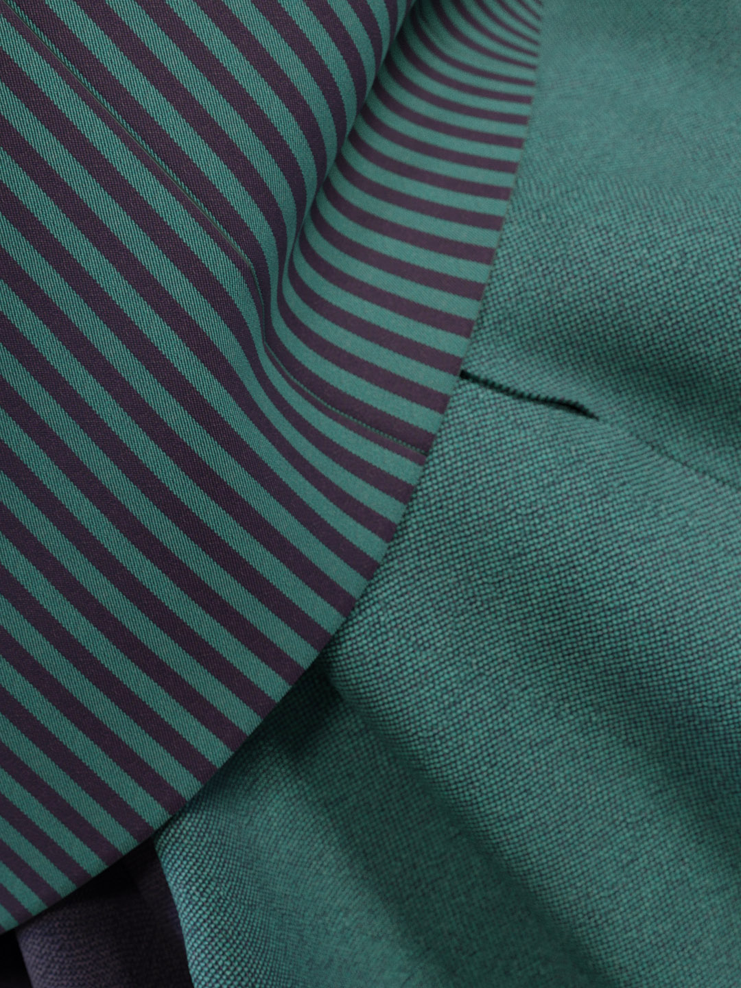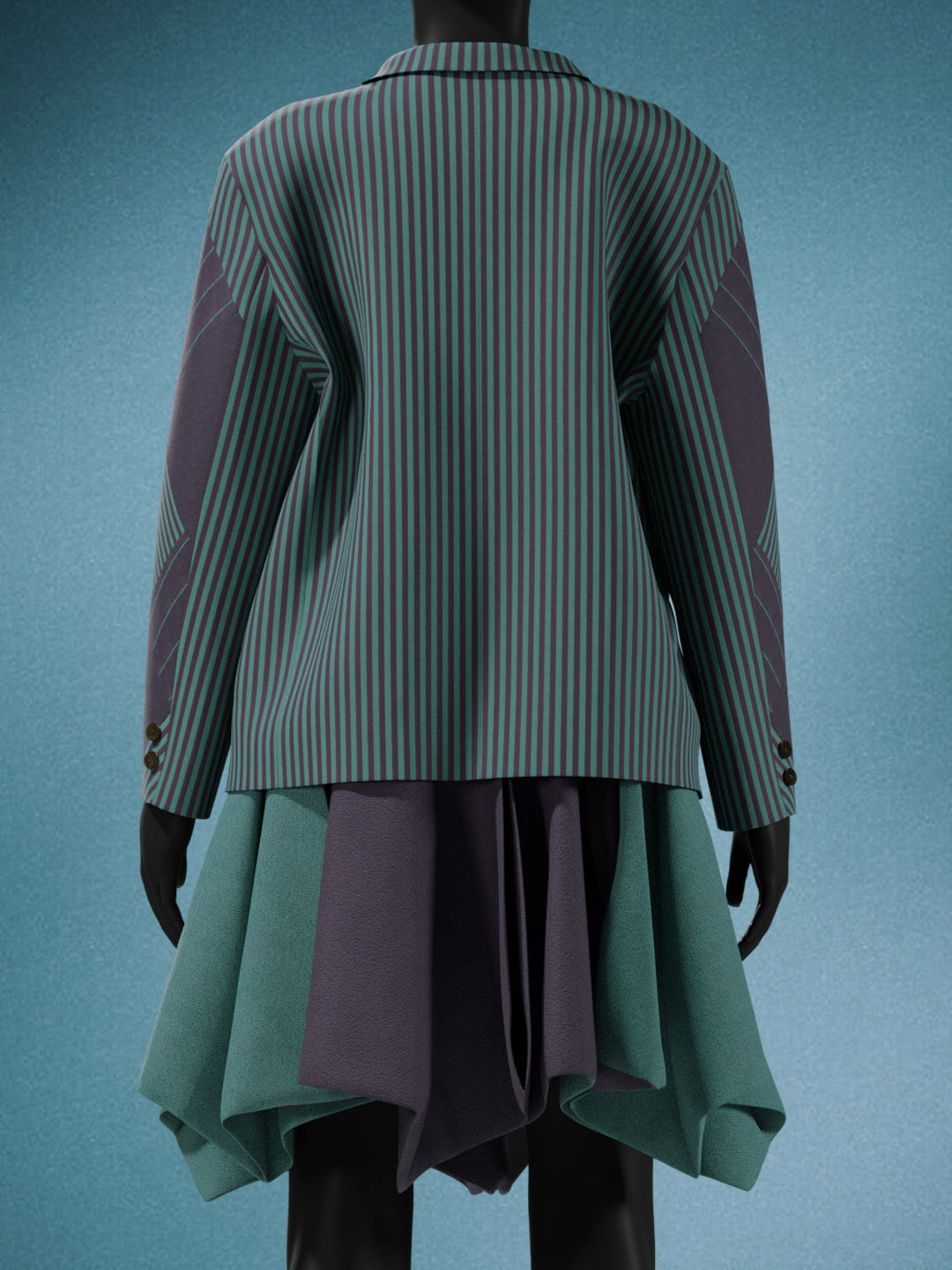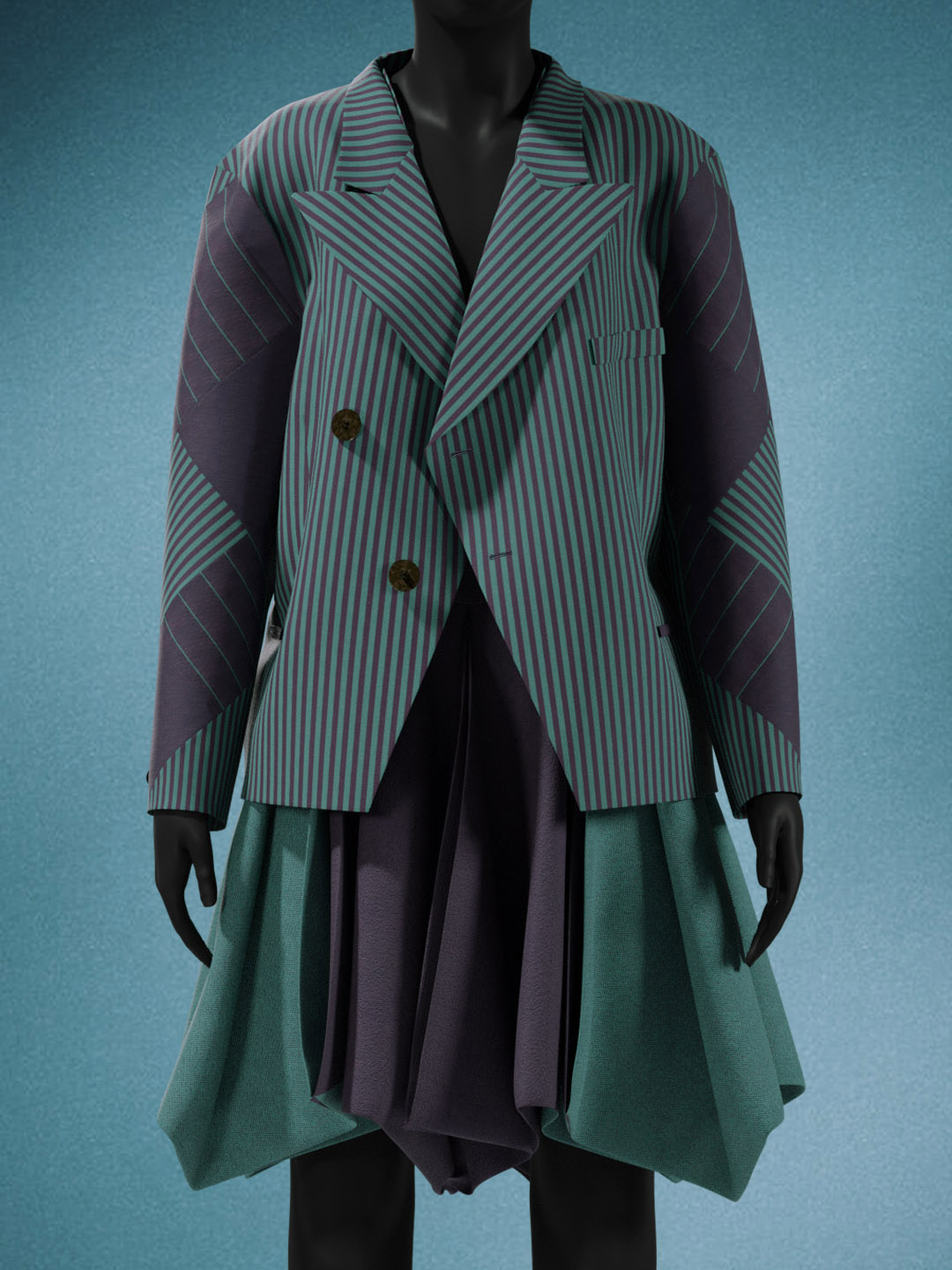 This full circle skirt with handkerchief hem is signature Miyake, created using a single piece of folded cloth to achieve structure and volume. The jacket features a patchwork of various green and navy striped patterns, perfectly considered and aligned.