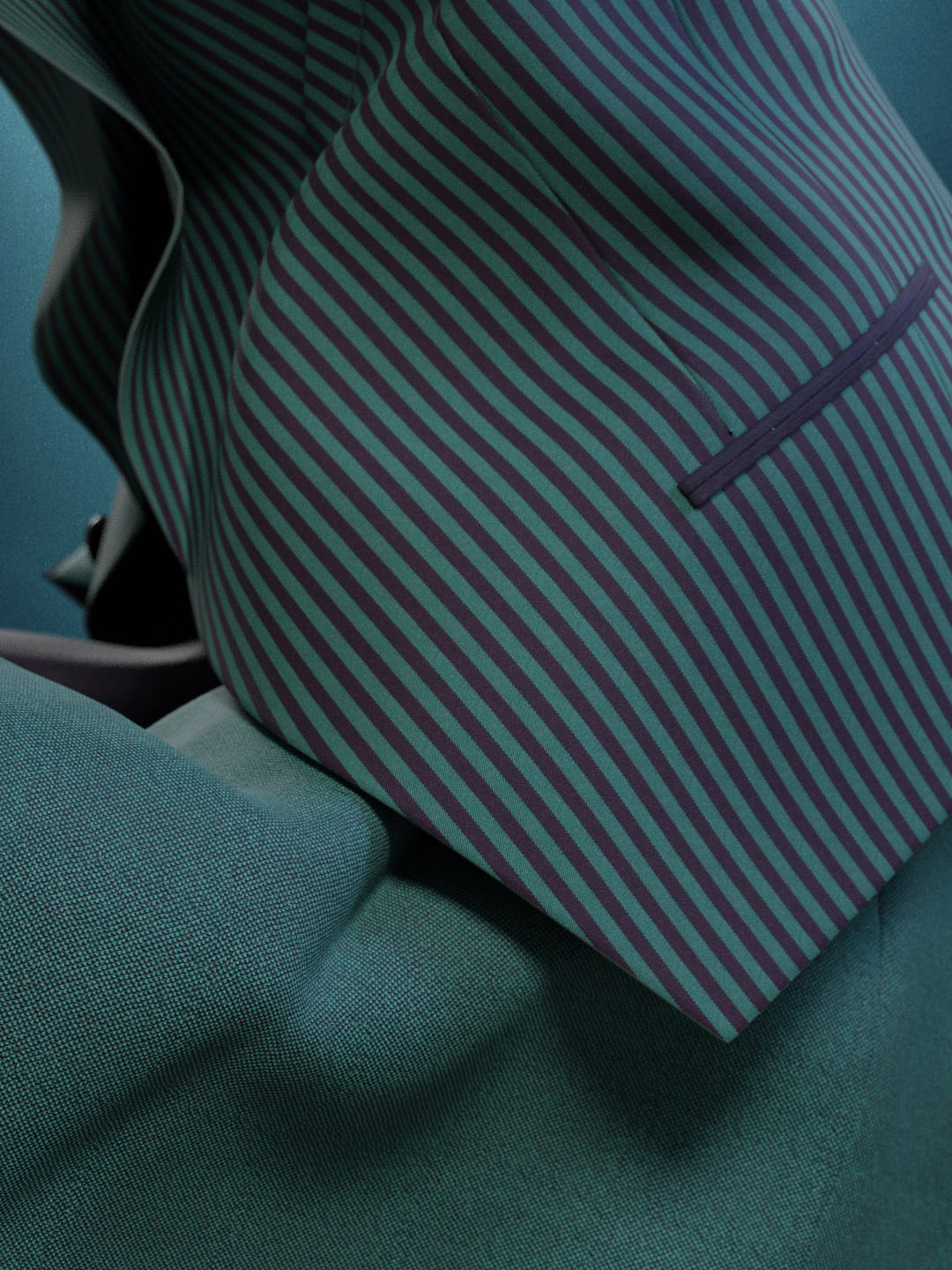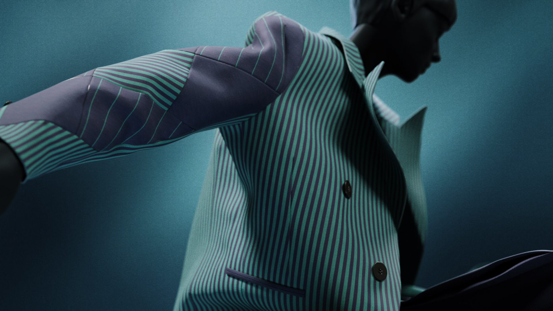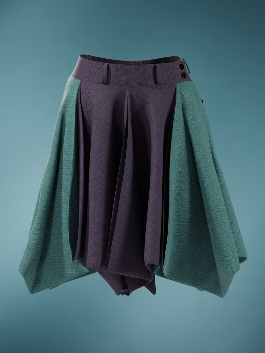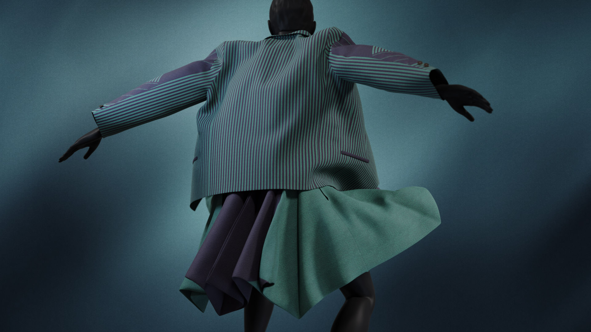 This full circle skirt with handkerchief hem is signature Miyake, created using a single piece of folded cloth to achieve structure and volume. The jacket features a patchwork of various green and navy striped patterns, perfectly considered and aligned.